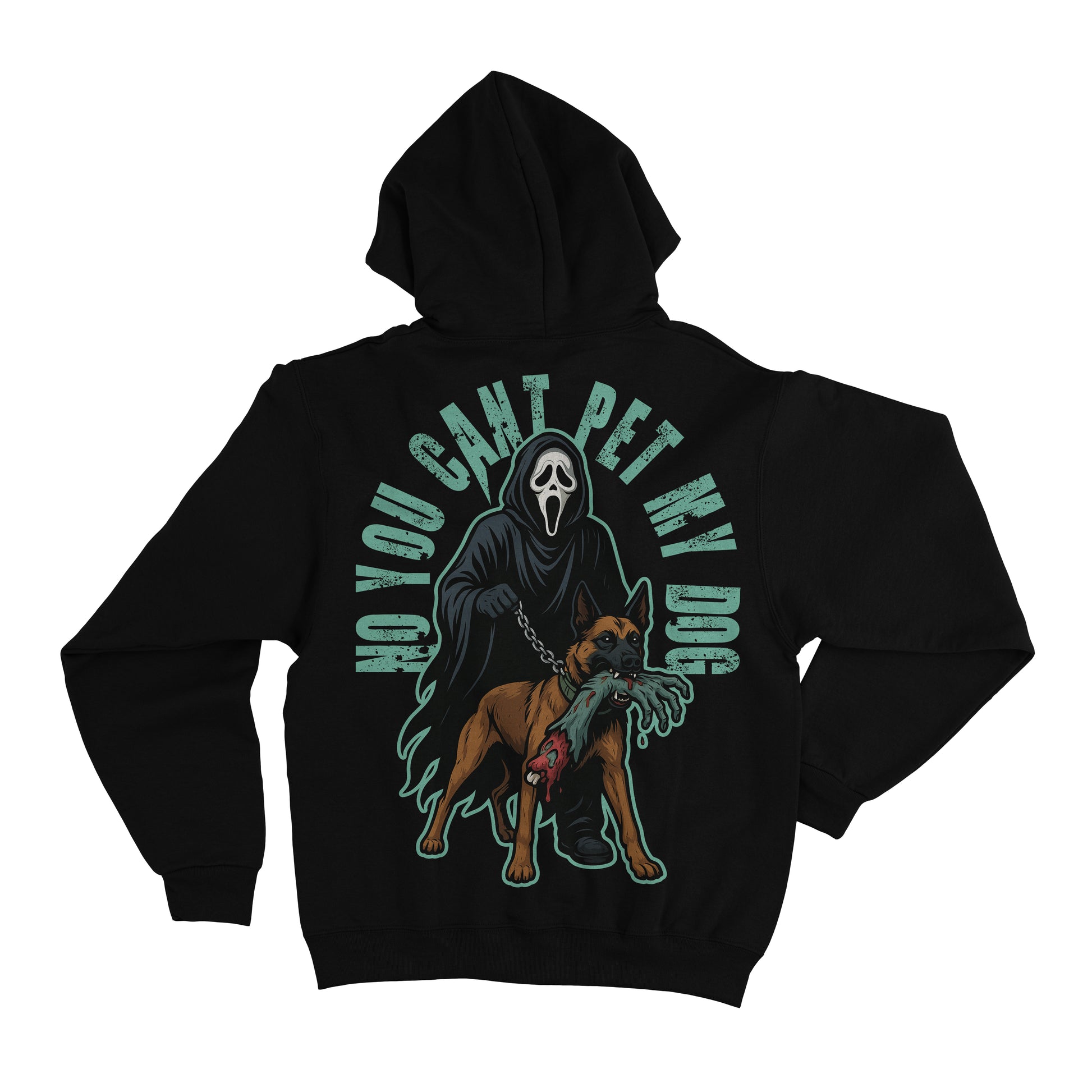 The No, You Can’t Pet My Dog hoodie unleashes Ghostface the Slasher—the horror icon himself—walking his loyal beast fresh off the hunt. Fangs still dripping, the dog grips a rotted zombie arm, a warning to anyone who doesn’t listen the first time.