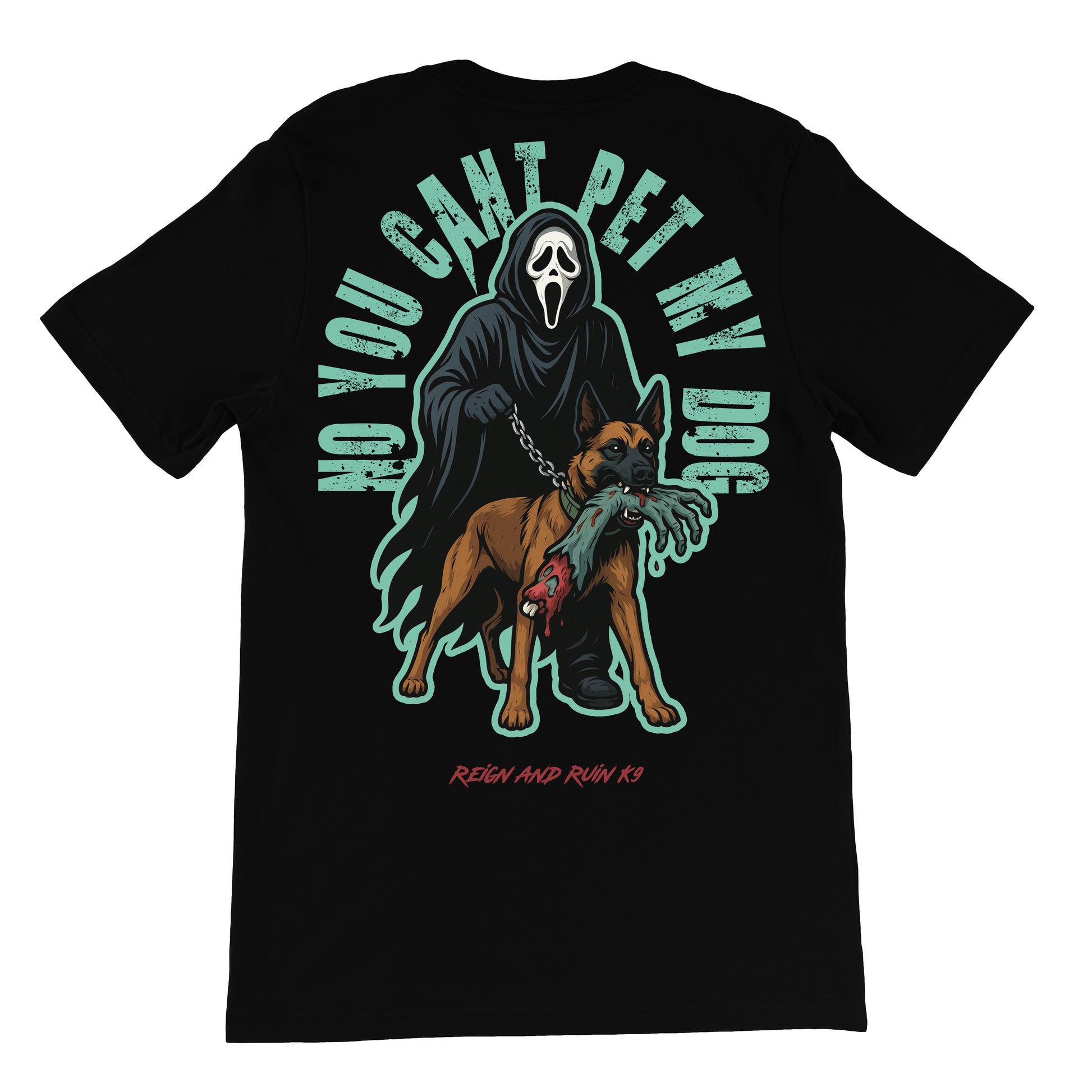The No, You Can’t Pet My Dog hoodie unleashes Ghostface the Slasher—the horror icon himself—walking his loyal beast fresh off the hunt. Fangs still dripping, the dog grips a rotted zombie arm, a warning to anyone who doesn’t listen the first time.