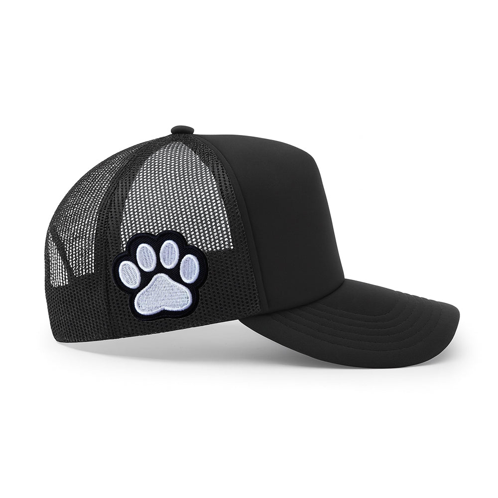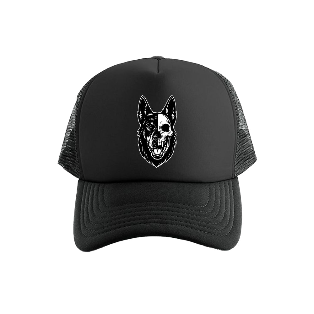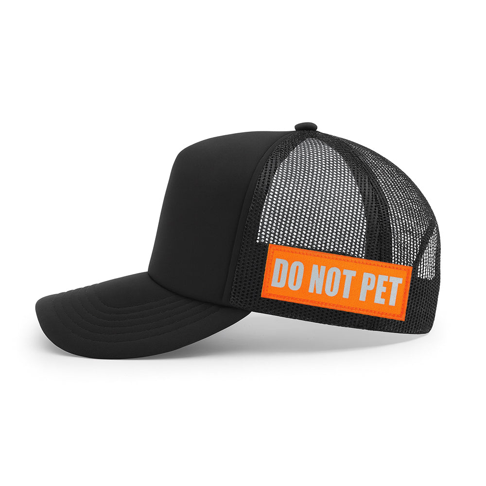 Our mesh trucker is built for the ones who run with their pack. Front and center, the Skull Hound logo makes its statement loud and clear. On the right side, a hand-sewn dog paw patch shows where your loyalty lies. On the left, a hand-sewn “Do Not Pet” patch sets the boundary before anyone even asks.